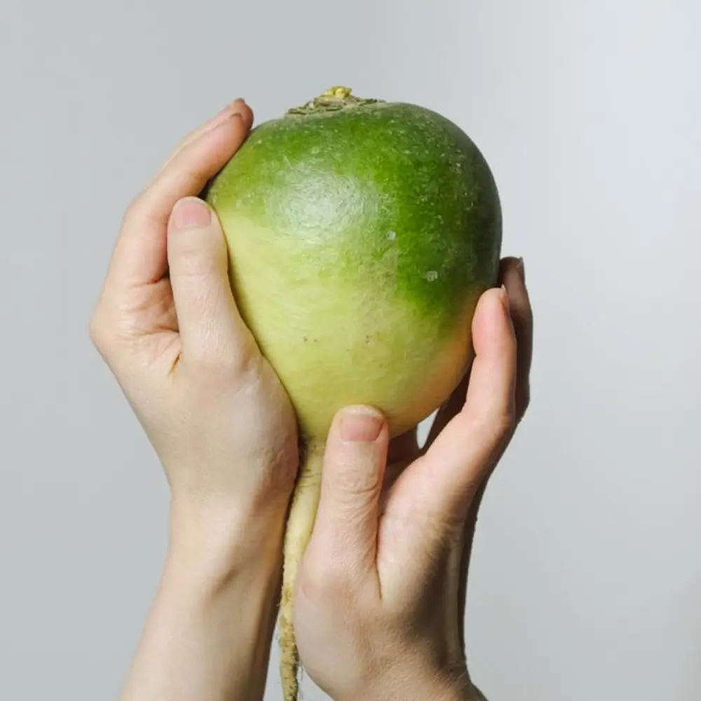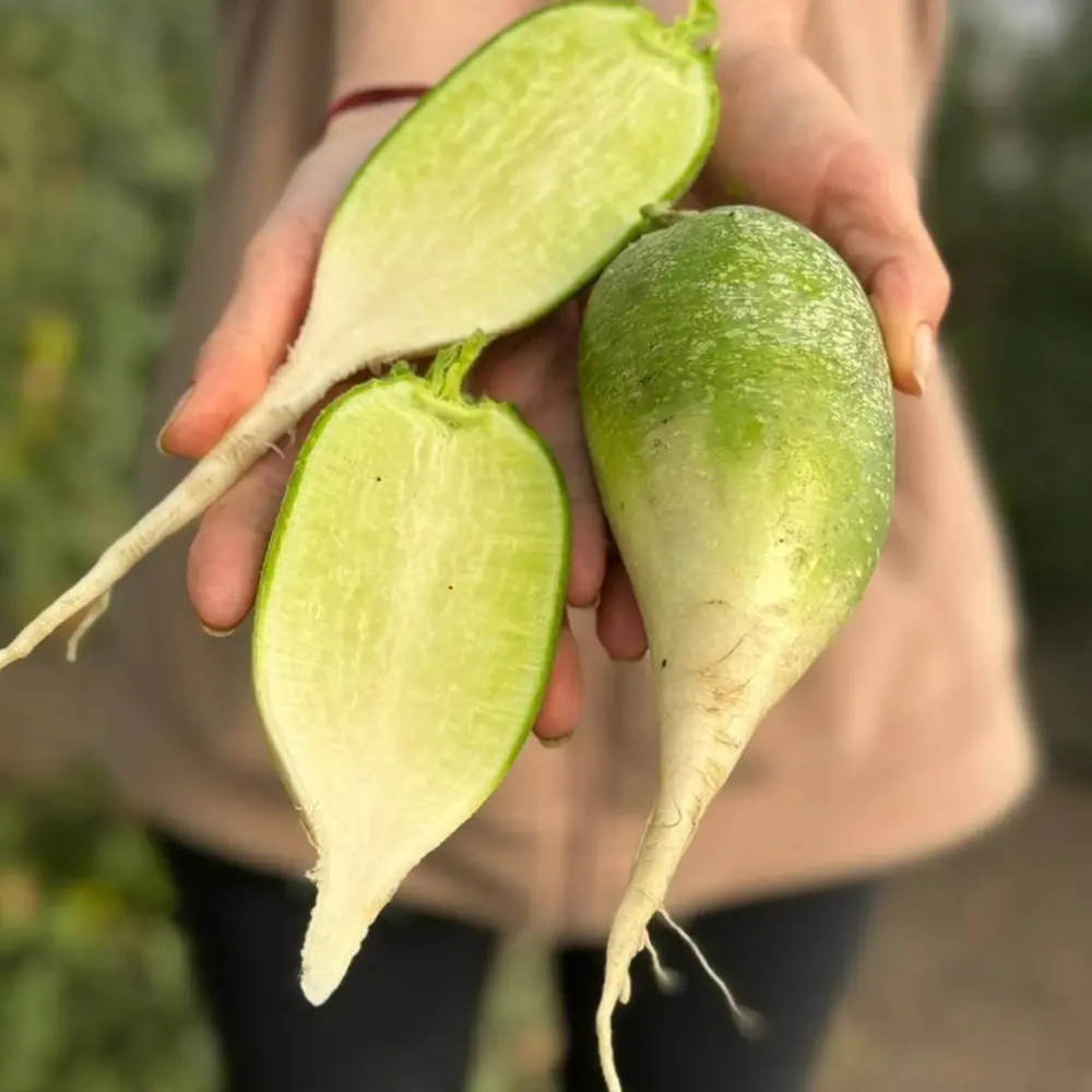 Это крупный корнеплод (200–400 г), вытянутый или округлый, с зеленой кожицей и белым кончиком, светло-зеленой мякотью. В отличие от черной редьки, она почти не горчит, сочетает остроту и сладость, подходит для свежих салатов.