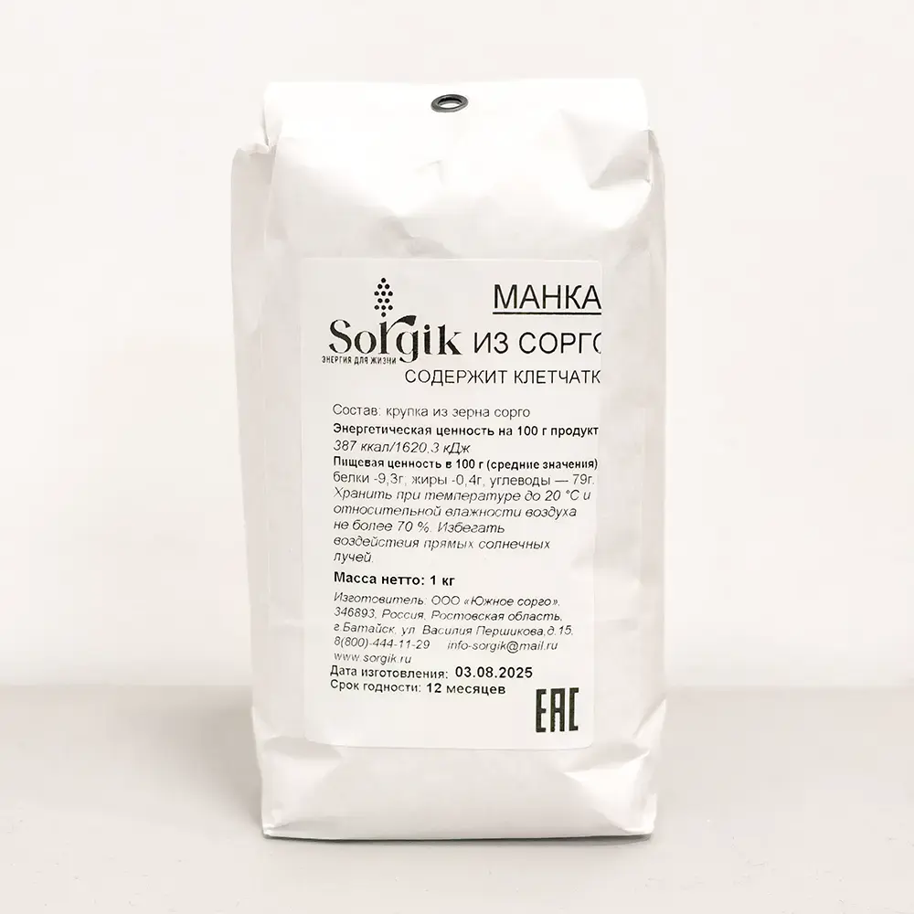 Сорговая манка (крупка из зерна сорго) - это безглютеновый, диетический, 100% натуральный продукт, для любителей здоровой и вкусной пищи. Манка из зерна сорго является богатым источником полифенолов и растительных белков, а так же железа и магния, что важно для здоровья сердца и кровообращения.