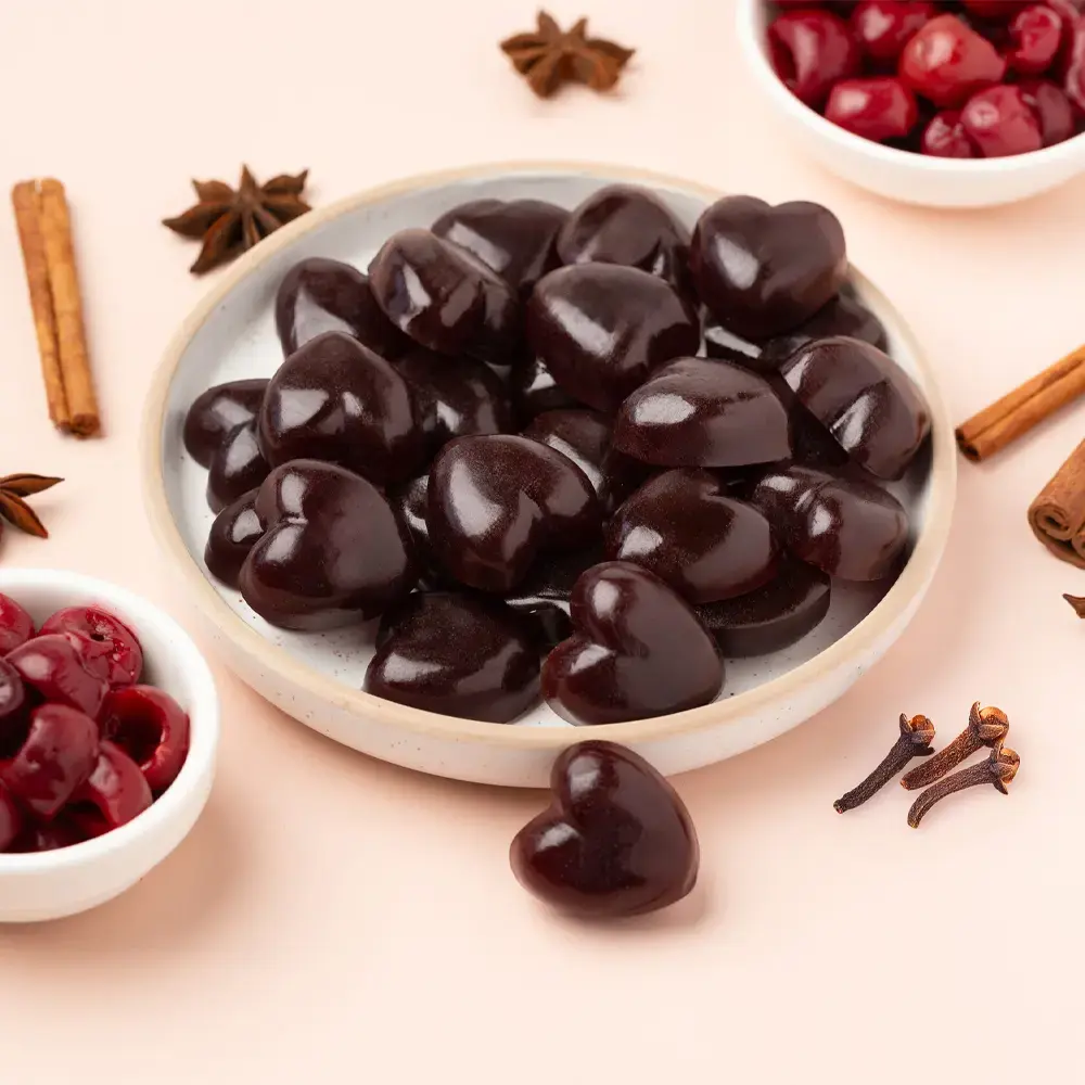 Состав: сок вишневый концентрированный, вода питьевая, сироп цикория (клубни цикория, вода питьевая), пюре яблочное, регулятор кислотности (цитрат натрия), загуститель (агар-агар), регулятор кислотности (лимонная кислота), консервант (сорбиновая кислота), корица молотая, имбирь молотый, кардамон молотый, гвоздика молотая, глазирователь (растительное масло, карнаубский воск, аскорбиновая кислота, токоферолы).