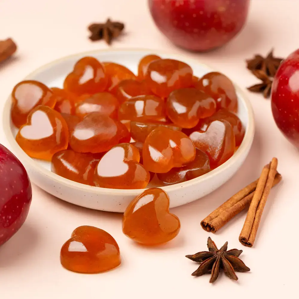 Состав: сок яблочный концентрированный, сироп цикория (клубни цикория, вода питьевая), вода питьевая, пюре яблочное, лимонный сок, регулятор кислотности (цитрат натрия), загуститель (агар-агар), консервант (сорбиновая кислота), корица молотая, кардамон молотый, глазирователь (растительное масло, карнаубский воск, аскорбиновая кислота, токоферолы).