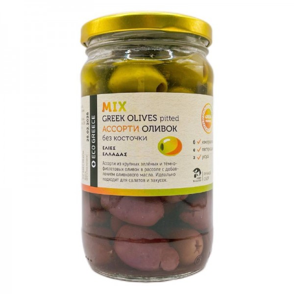 Оливки Каламата и Халкидики (без косточек) натурального созревания, приготовленные по традиционному греческому рецепту без консервантов и пастеризации.