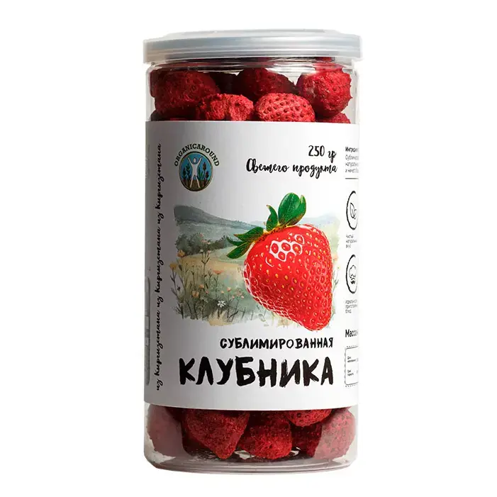 Созревшая под тёплым солнцем кыргызских долин, эта клубника бережно отобрана и сразу же прошла процесс сублимационной сушки, чтобы сохранить всё самое ценное — аромат, вкус и пользу свежих ягод.