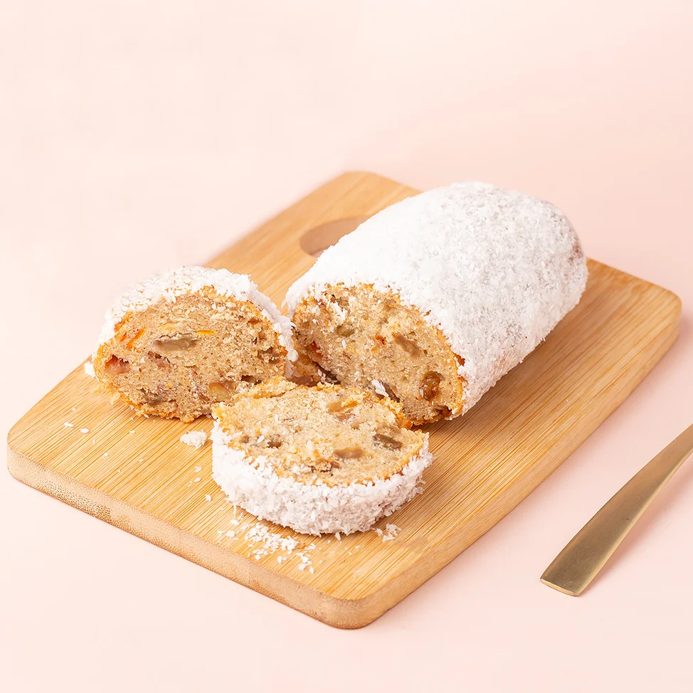 Состав: смесь белый хлеб (мука рисовая, крахмал тапиоковый, крахмал кукурузный, мука амарантовая, мука льняная), изюм, кокосовые сливки, вода, сироп топинамбура, урбеч кешью, миндаль, курага, цукаты топинамбура, дрожжи, псиллиум, безглютеновый разрыхлитель (дигидропирофосфат натрия, сода пищевая, кукурузный крахмал), ром, соль, цедра апельсина, цедра лимона, ксантановая камедь, корица, экстракт ванилина, гвоздика, кардамон. Посыпка - кокосовая стружка.